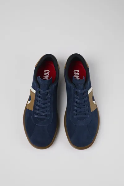 Blue nubuck/leather men’s sneakers with lace closures, recycled OrthoLite® footbeds, and rubber outsoles.