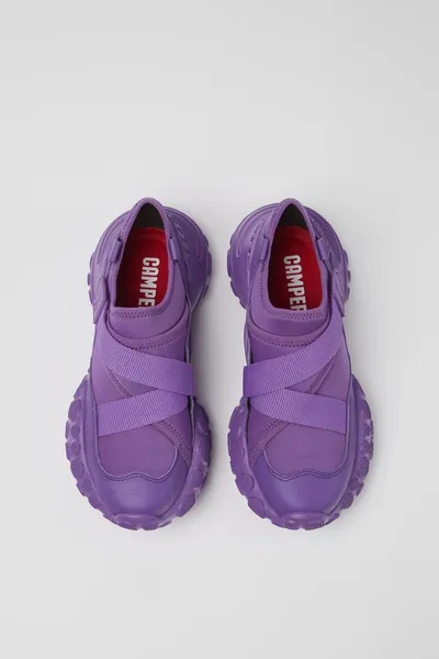 Purple women’s sneakers with recycled polyester and leather, recycled OrthoLite® footbeds and 100% EVA outsoles.