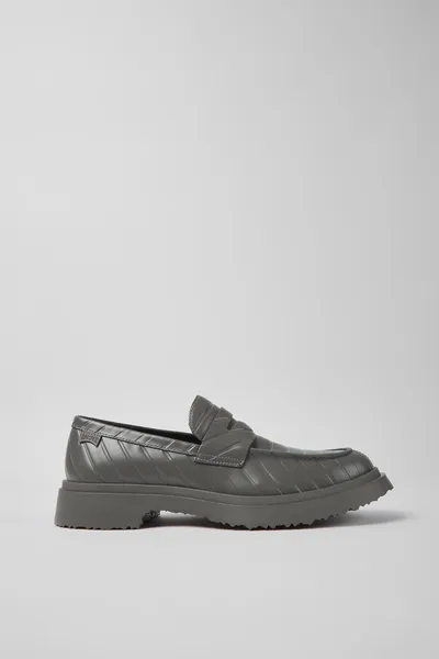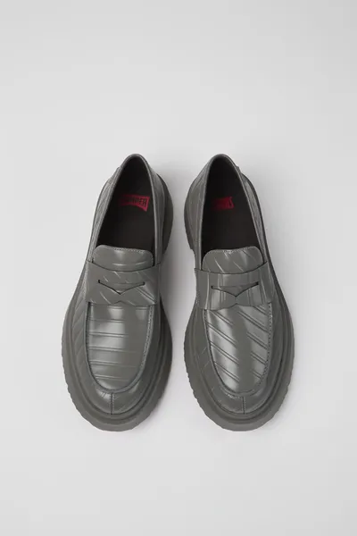 Gray leather men’s loafers with OrthoLite® Recycled™ removable footbeds and rubber outsoles.