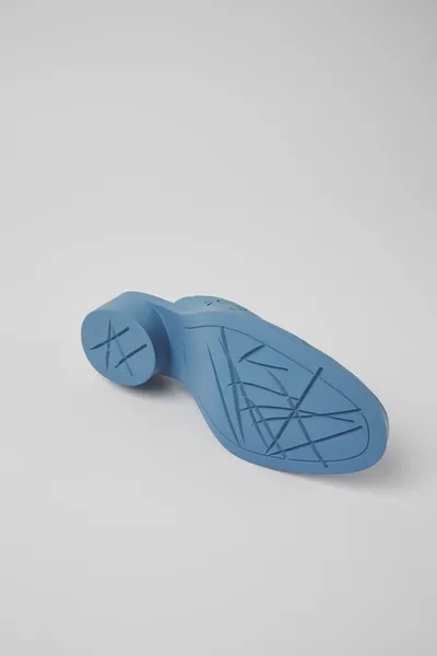 Blue leather women’s mules with cut-out flower motif, OrthoLite® Recycled™ non-removable footbeds, and rubber outsoles (20% recycled).