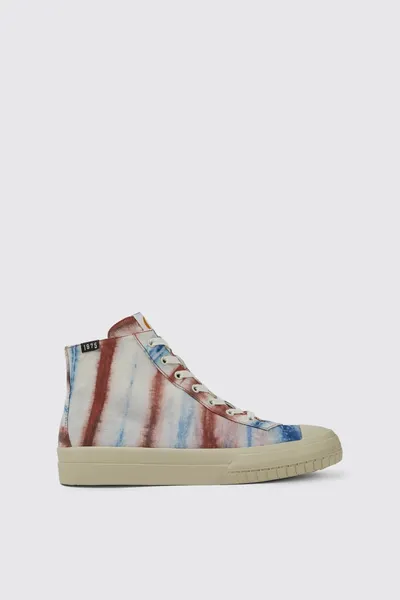Multicolored 100% organic cotton men’s sneakers with tie-dye textile uppers made in collaboration with the Ethical Fashion Initiative. 23% recycled rubber and 40% natural rubber outsoles.