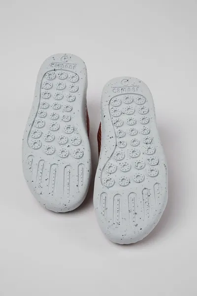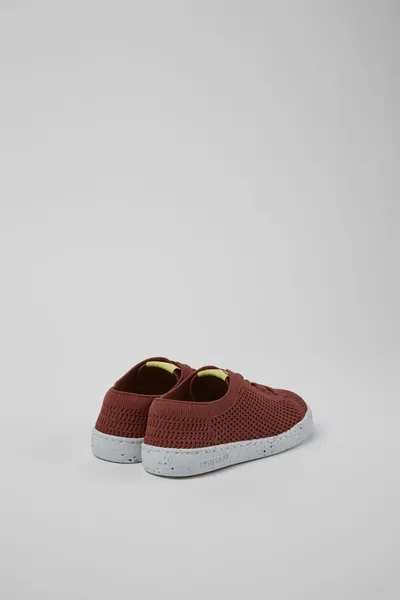 Red textile kids’ slip-on shoes with lace closures, OrthoLite® Recycled™ footbeds and EVA outsoles.