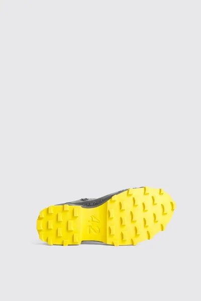 Vulcanized black leather zip boots with yellow toothed rubber outsoles.