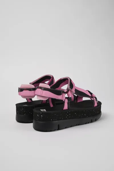 Multicolored textile women’s sandals with recycled polyester webbings and linings, and XL EXTRALIGHT® EVA outsoles.